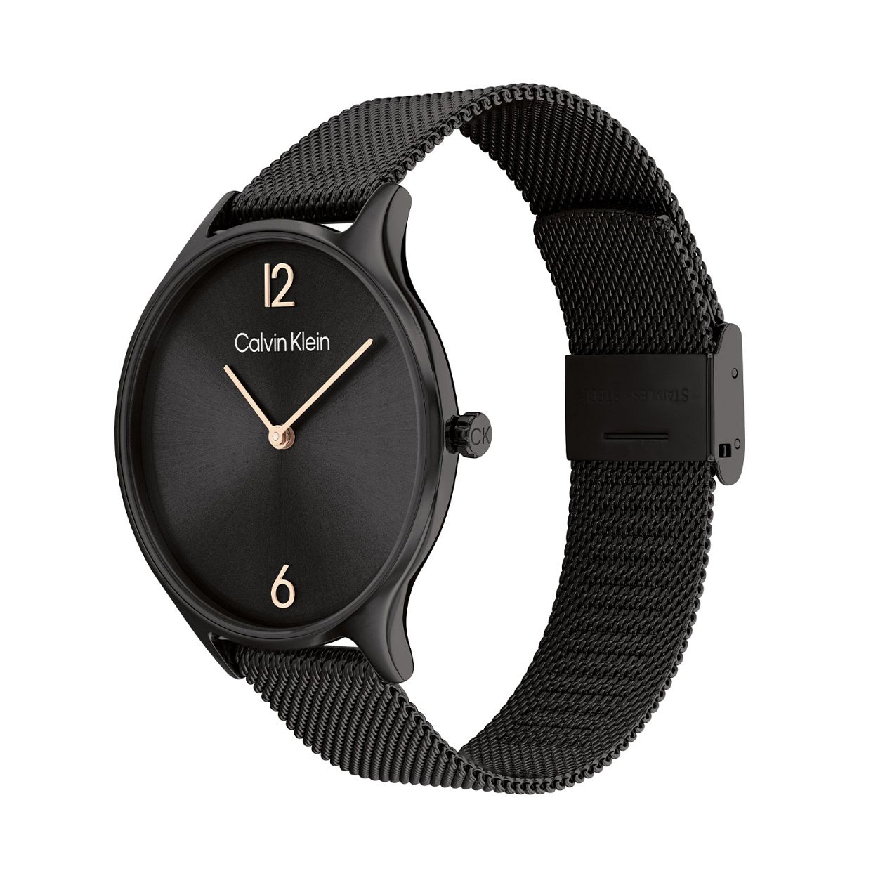 Dit Calvin Klein dameshorloge met nr CK25200004 heeft een strak en minimalistisch ontwerp. De stijlvolle ronde gladde stalen kast heeft een zwarte wijzerplaat met alleen de 12 en 6 aanduiding, de merknaam, en hele fijne wijzers. Aan de zwarte kast zit een zwarte milanese band, dat geeft een chique uiterlijk. Het strakke horloge heeft een mineraalglas, een doorsnee van 38mm en is 3 ATM.