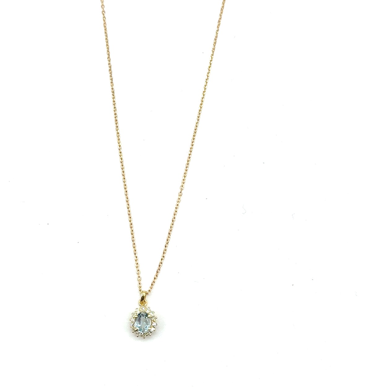 14k geelgouden diamanten ketting met een natuur aquamarine steen.