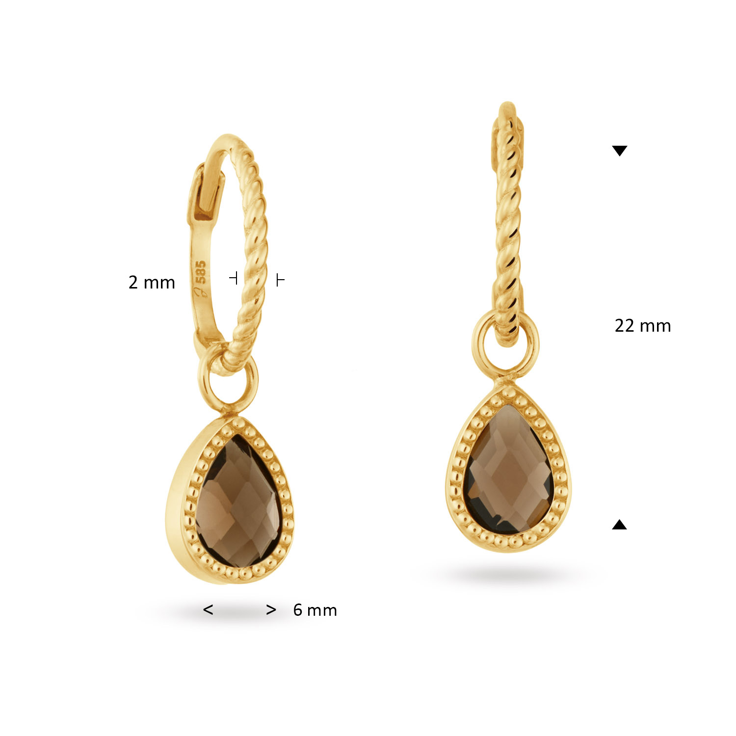 Een klassieke hanger met een echte Rookkwarts edelsteen aan een 14 karaat gouden oorbel. Rookkwarts is een bruine tot zwarte variëteit van de kwarts en staat  bekend om zijn aardende en beschermende eigenschappen.