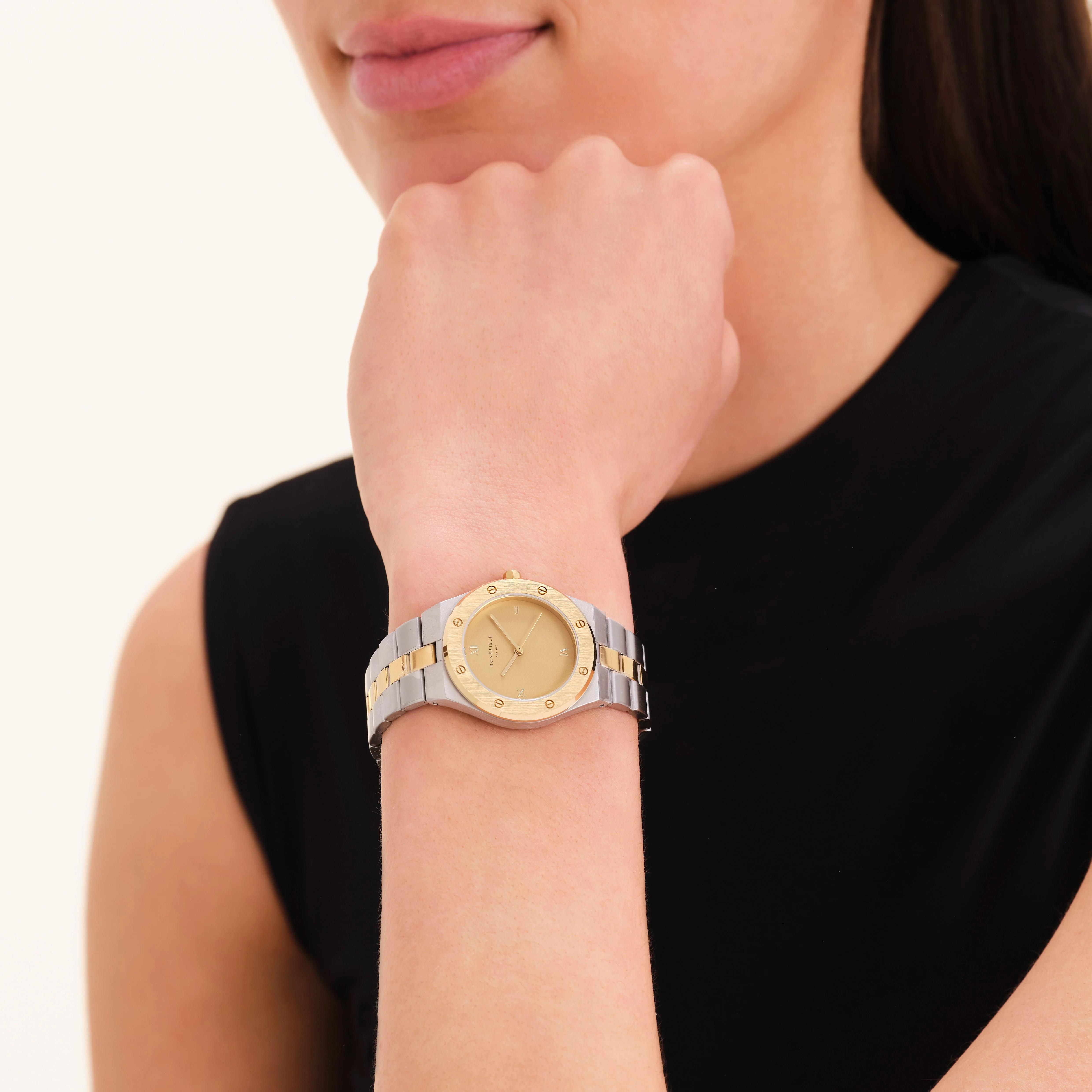 De Rose Cappuccino Matte Duotone Gold Silver horloge, modelnummer SPCDSD-SP05, heeft een metalen kast en band in goud-zilver kleur. Het heeft Romeinse cijfers op de wijzerplaat, geen licht- of datumfunctie, en een kastdikte van 7,7 mm. Waterdicht niveau 3. Draag het stijlvol bij formele en casual outfits voor een elegante uitstraling.