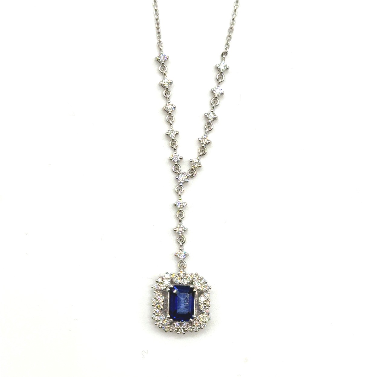 14k witgouden diamanten collier met 1.34 caraat natuur saffier. totaal diamanten zijn 0.63 caraat f kleur.