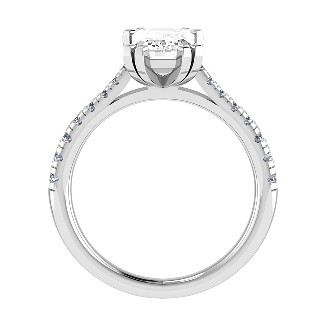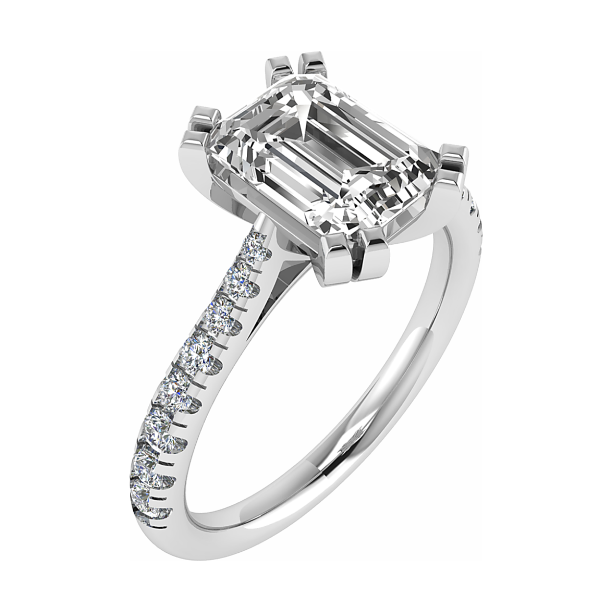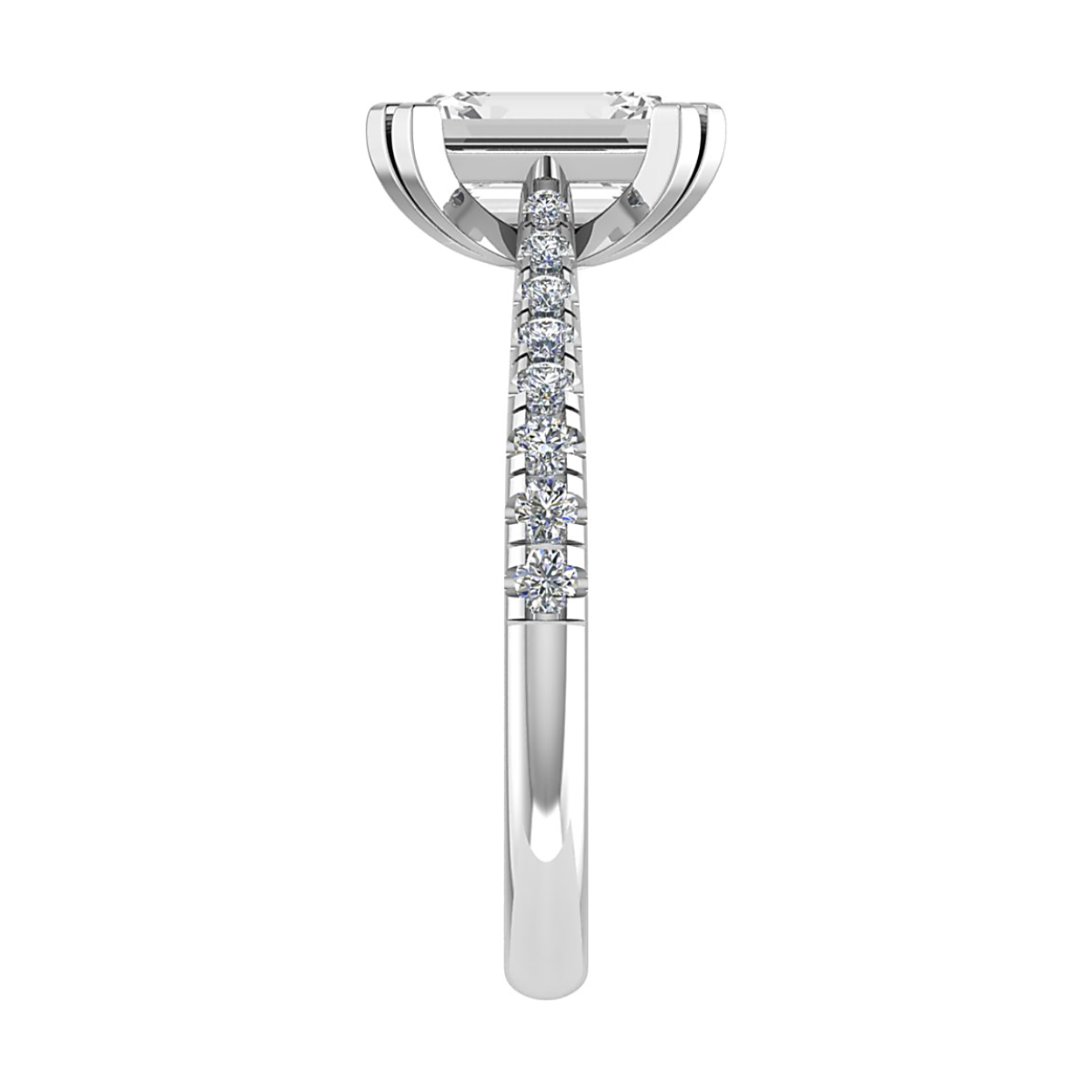 14k gouden ring met een 1,00 caraat emerald cut lab grown diamant. midden lab diamant is 1,00 caraat met d kleur en een VS 1 helderheid. zijde diamanten hebben totaal 0,25 caraat.